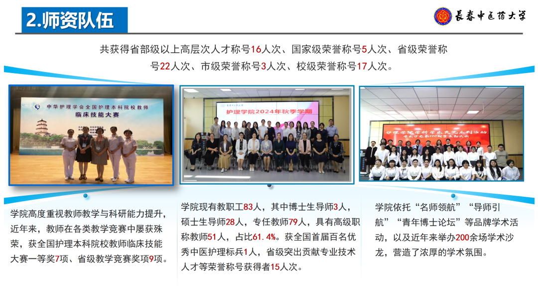 学院拥有一支结构合理、专业精湛、富有创新精神的高水平团队队伍。现有教职工83人,其中博士生导师3人、硕士生导师28人、专任教师79人,具有高级职称教师51人,占比61.4%。团队队伍中涌现出全国首届百名优秀中医护理标兵1人,省级突出贡献专业技术人才等荣誉称号获得者16人次。