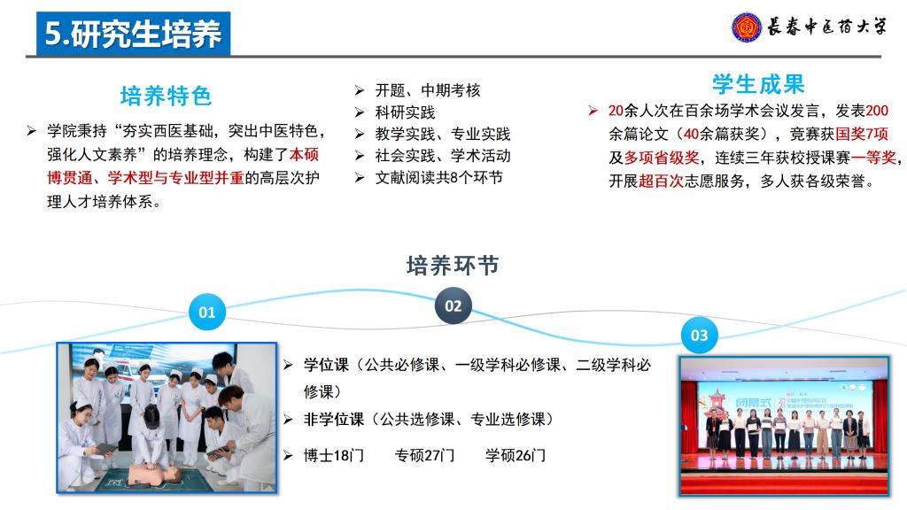 研究生课程体系完善,中医护理学博士学术学位设18门课程,护理硕士专业学位设27门课程,学术学位设26门课程,涵盖必修与选修模块。培养过程严格规范,涵盖开题、中期考核、科研实践等8个必修环节,实施以临床问题为导向的多学科交叉培养模式,并建立分流淘汰机制,全面保障培养质量。